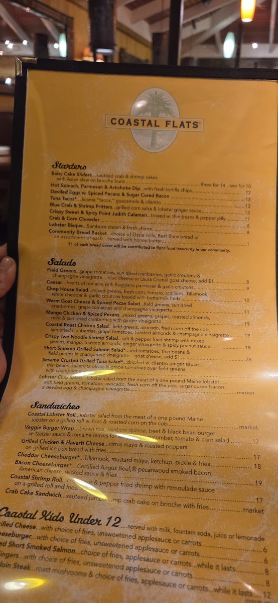 The menu complements the spacious, inviting atmosphere of the restaurant, where you can enjoy complimentary warm rolls alongside your main plate, making for a cozy yet unfussy dining moment. Coastal Flats balances traditional American plates with fresh, thoughtfully prepared seafood and classic accompaniments, making it easy to find something to enjoy regardless of the occasion.